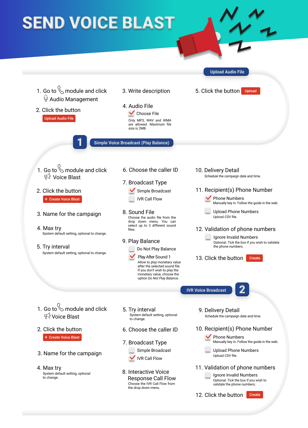 Broadcast with IVR menu selection and broadcast with IVR menu selection and route to agents or send a SMS response.